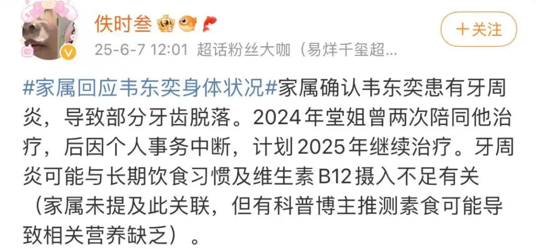 更重新的是,韦神的家人宁愿让他开网络账号,坐拥流量,也不愿带他去好好看过牙,更没有亲人为他打理好生活,让他能好好钻研学术。