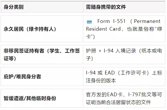 编者注:很多人希望明确到底什么证件符合证明移民身份证件,根据《移民与国籍法》(Immigration and Nationality Act, Section 264(e))所有年满十八岁的外国人,必须随时携带并持有其获发的外国人登记证明或登记收据卡。在法律与行政规则中,“alien registration document” 指的是由移民局(USCIS)或国土安全部(DHS)签发、直接表明移民身份的证件,包括: