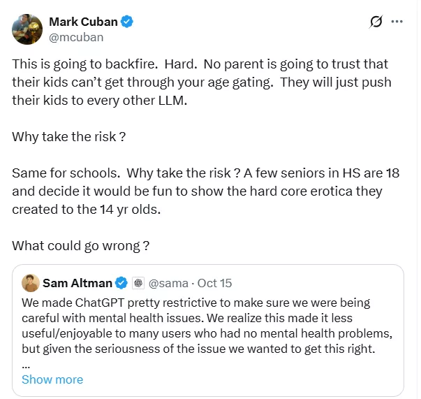 亿万富翁投资者马克·库班也公开警告称,OpenAI允许在ChatGPT中生成成人内容的决定,正在家长和学校中引发信任危机。如果家长怀疑未成年人有可能绕过年龄验证系统接触到不良内容,就会毫不犹豫地弃用ChatGPT。