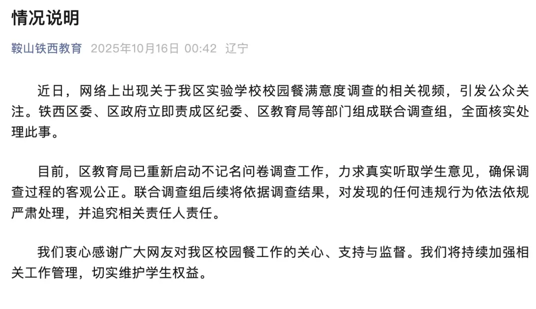 10月16日凌晨,铁西区教育局发布情况说明,表示当地已组成联合调查组,全面核实处理此事。目前,区教育局已重新启动不记名问卷调查工作,力求真实听取学生意见,确保调查过程的客观公正。