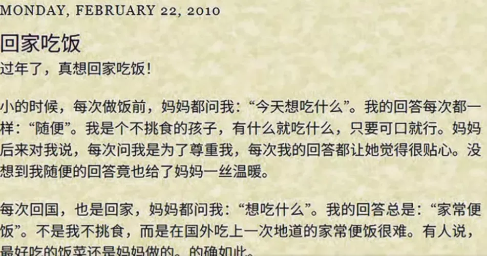 她在博客中记录的人生信条是:“愚者在远方寻找幸福,智者在脚下培育幸福”。