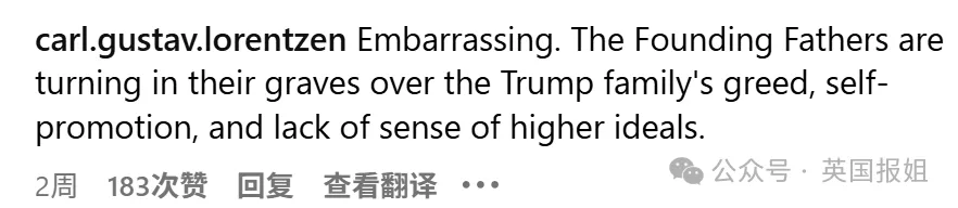 “尬死了。美国的开国元勋们在九泉之下想必也会因特朗普家族的贪婪、自我推销以及缺乏更高理想的思想状态而压不住棺材板。”