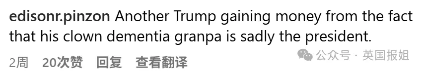 “又一个川普家族成员仅仅是因为家里那患有痴呆症的滑稽老头儿当上了总统,就能大发其财的例子...”