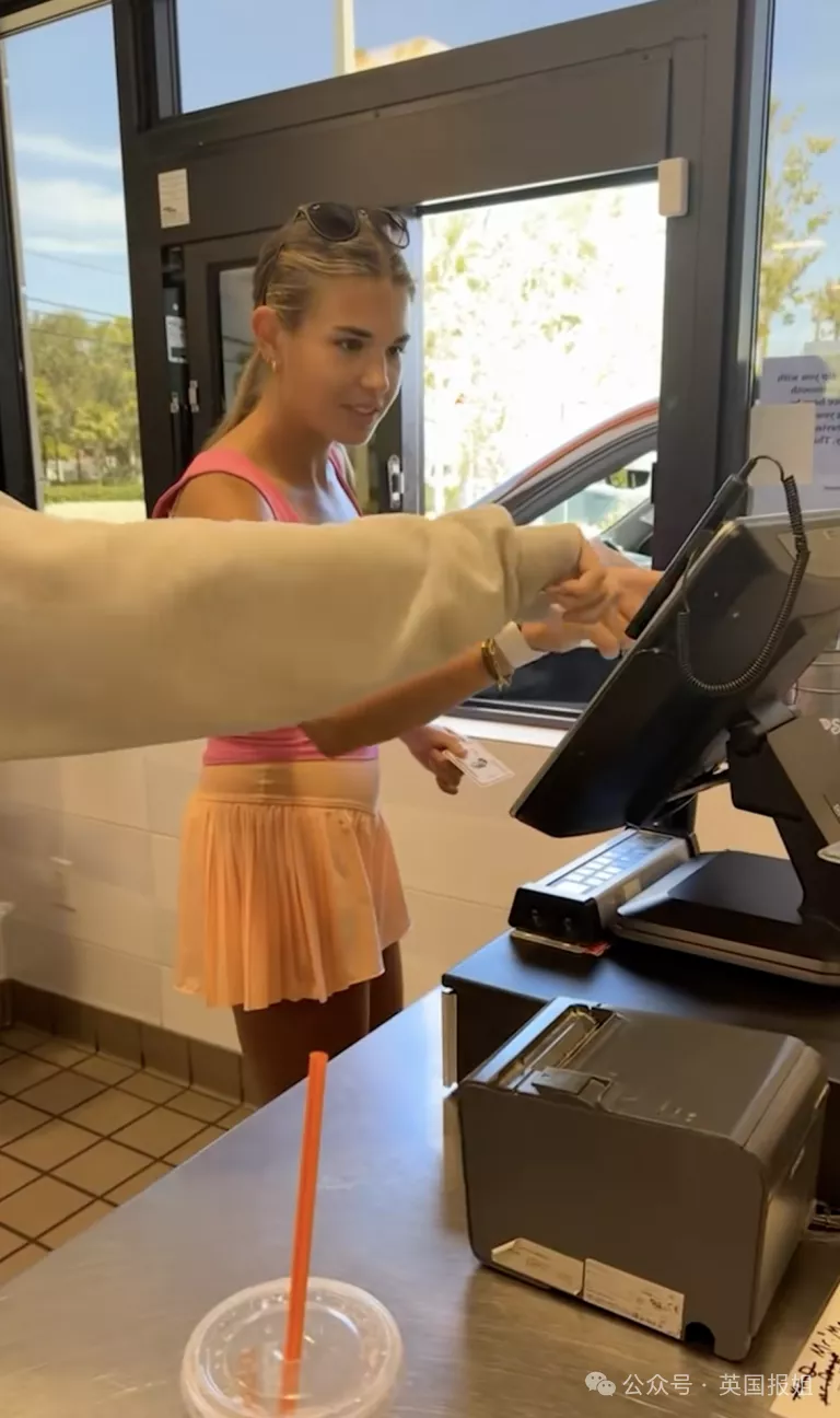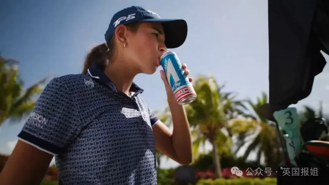 视频里她打完高尔夫后转身走向休息区,从运动饮料和健怡可乐中选择了前者,边喝边说——“对不起,爷爷”。