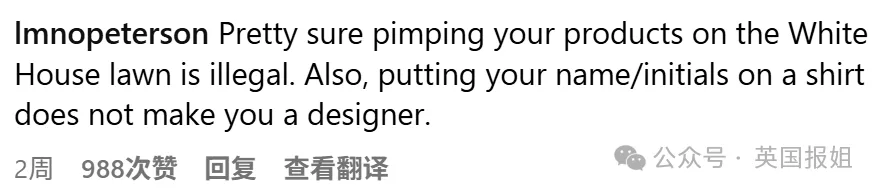 “非常确定在白宫草坪上推销你的产品是违法的。而且,在衬衫上印上自己的名字或首字母并不能让你成为设计师。”