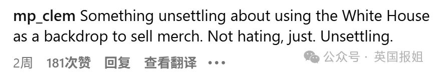 “把白宫当作背景来卖自己商品,这事儿有点让人心里不得劲。倒也不是讨厌,就是觉得挺别扭的。”