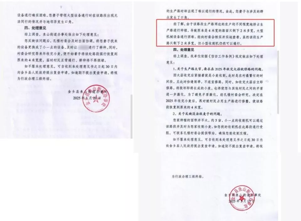 极目新闻记者获取的今年1月和5月鱼山街道办事处相继给李先生的书面答复中均提到,在今年收完麦子后,开始着手将该处路段恢复到原来的4米宽度,届时村民正常通行、耕种将不再拥堵。