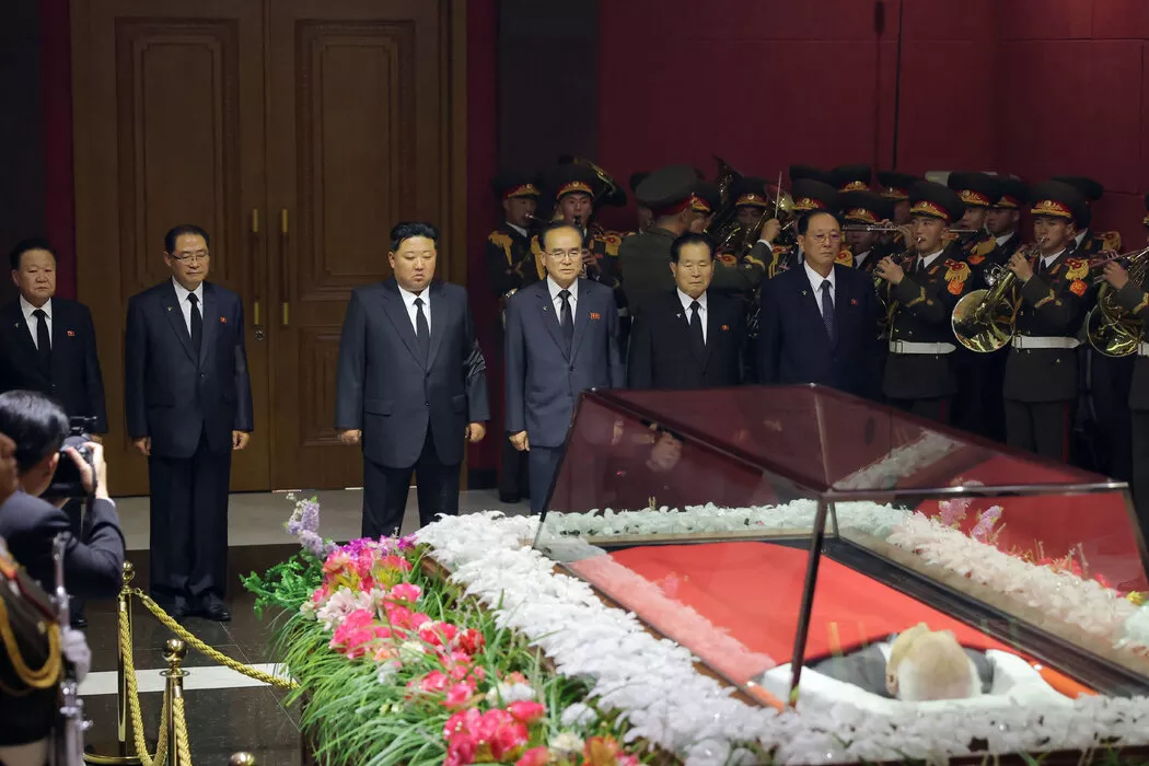 朝鲜官方媒体提供的一张照片显示,朝鲜领导人金正恩(左三)在朝鲜某未公开地点凭吊金永南的遗体。