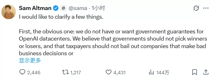 在帖子的评论区里,网友们纷纷表示,这番“不需要美国政府担保”,但喊话美国政府花钱大量建设算力的表态,看着有点割裂。
