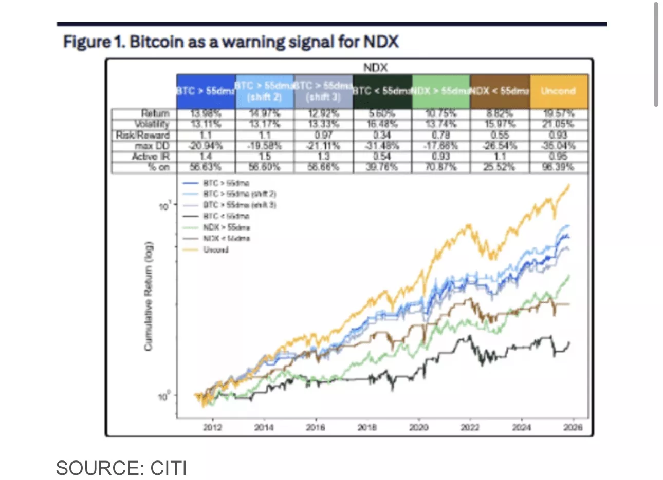 “我们过去已经显示出,当比特币表现良好时,纳斯达克指数走势也更好,反之亦然。”花旗表示,“特别是,只在比特币高于其55日均线时(并滞后一日)持有纳斯达克指数头寸,可以将该指数的主动信息比率从0.95提升到1.4,这种效果在滞后两天或三天的情况下同样显著。”