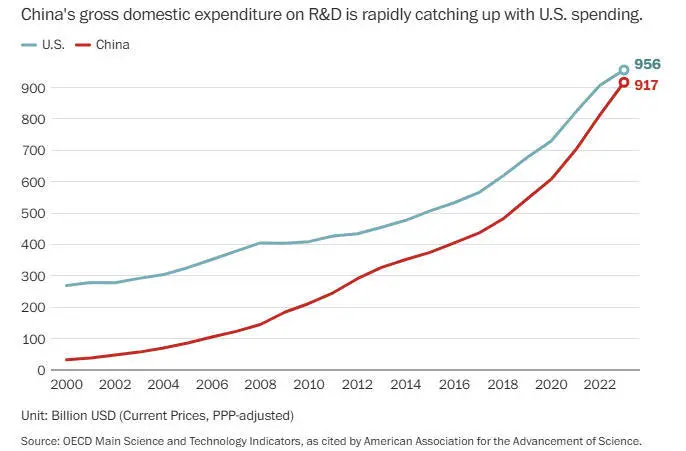 据美国科学促进会数据,20年前,美国的研发支出几乎是中国的四倍;但到2023年,美国政府和私营部门的研发总支出为9560亿美元,仅略高于中国的9170亿美元。