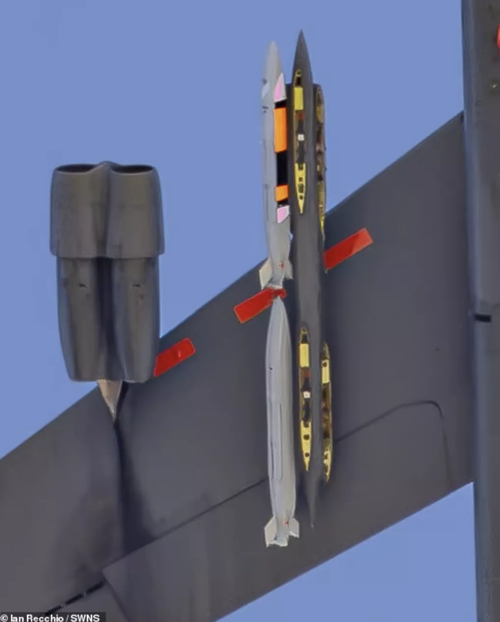 这架轰炸机带有典型的橙色测试标记,机翼上悬挂的两枚武器与外界流传的AGM-181A渲染图高度相似。