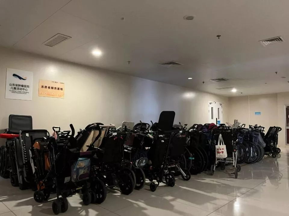 山东肿瘤医院儿童病房外,放满了生病孩子的推车