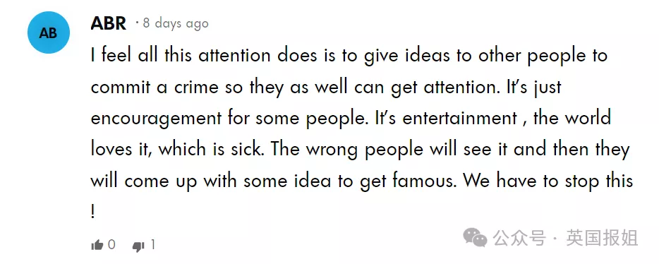 “我觉得对路易吉的关注只会给同类人提供犯罪灵感,让他们也能获得关注。这对有些人来说简直是一种鼓励机制。把法制咖娱乐化成了全球看点,真是病态。心怀不轨的人看到后,就会动歪脑筋想出名。我们必须阻止这种情况!”