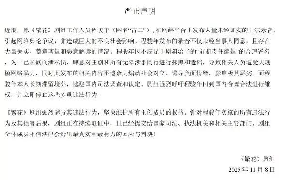 周六(8日),《繁花》剧组发表严正声明,针对程骏年(网名“古二”)近日在网络平台上发布的多段未经证实的录音作出回应。剧组指出,这些录音引发了广泛的争议,并造成了严重的社会影响。