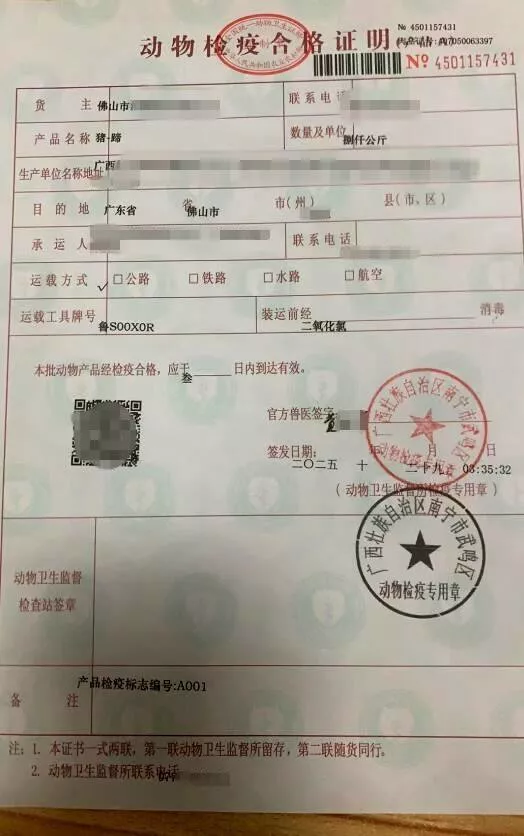 高先生出示的《动物检疫合格证明》。(受访者供图)