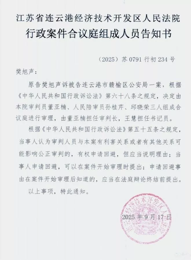 樊旭声对此表示不理解,认为女儿的死亡并未被立案,为何会涉及刑事案件类信息。10月29日,连云港开发区法院对此案公开开庭。樊旭声也在11月初向法院提交了补充材料。11月14日,《澎湃新闻》联繫了赣榆区公安局,有关负责人没有对樊蕊的死因及行政诉讼进行具体回应。