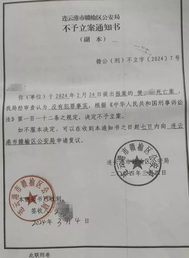 樊旭声在接受《澎湃新闻》访问时提到,在女儿去世后不久,他得知她体内检出男性精液,这让他对死因产生了怀疑。2025年4月,他向公安局提交了信息公开申请,要求公开调查结论及不进行尸检的依据。警方于6月回覆,称申请内容属于刑事案件信息,未在公开范围内。随后,樊旭声正式向法院起诉了赣榆区公安局。