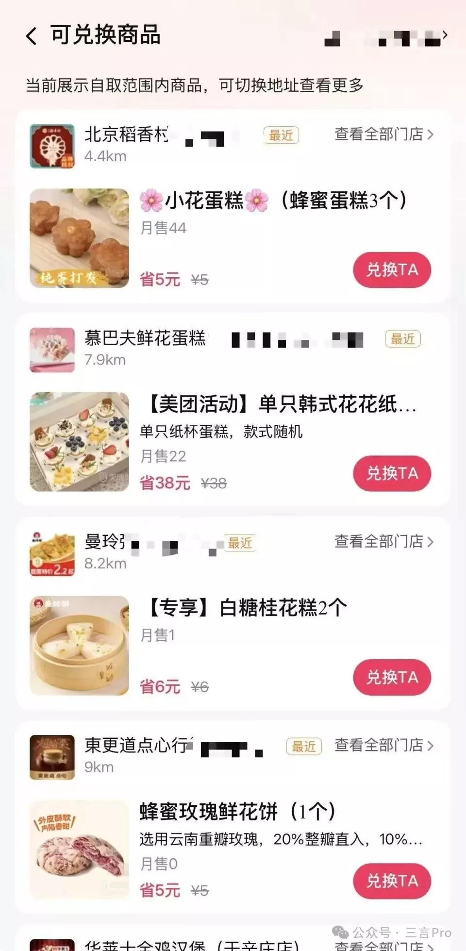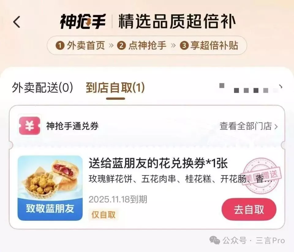 用户领了花后,可以免费领取有“花”这个关键词的东西,比如鲜花饼、五花肉串、开花肠等,不过要到店自取。