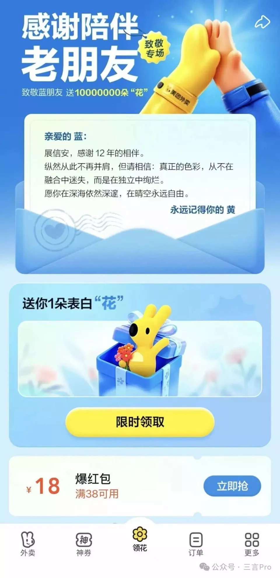 点开能看到,美团专门真搞了一个表白活动,“感谢陪伴老朋友”、“致敬蓝朋友,送1000万多花”。