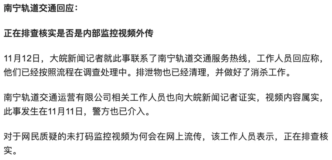 南宁地铁表示,目前此事已经按流程处理,已经清理了污物,同时也做好了消杀工作,对于视频为何会在网络上流传这件事,已经排查核实,如果视频是内部人员私自将监控外传的话,这已经涉嫌违法。
