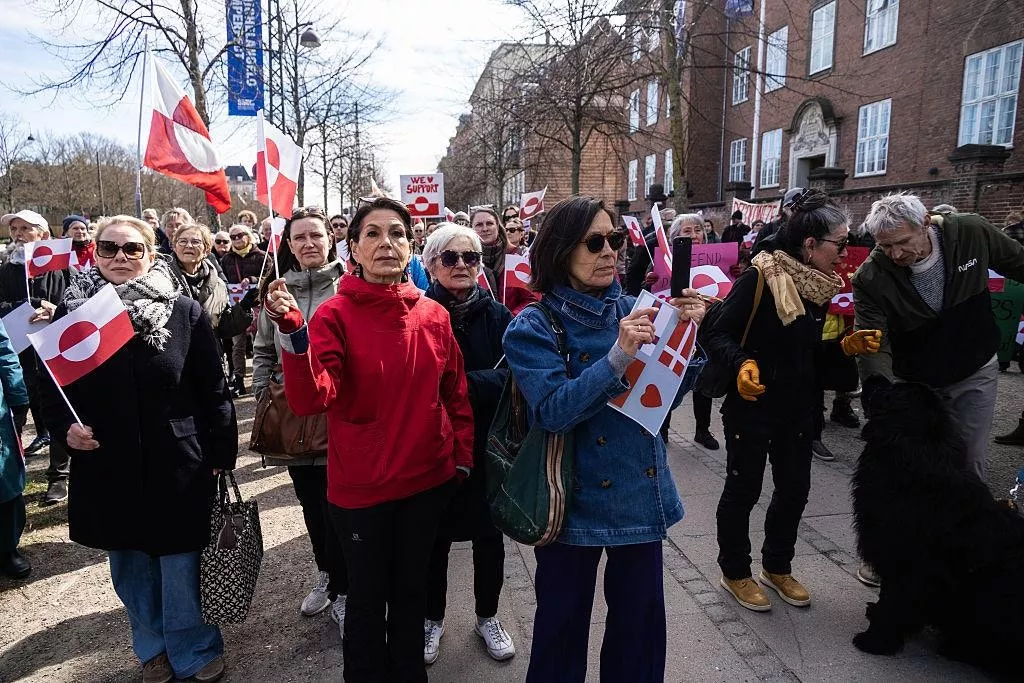 2025年4月6日,丹麦哥本哈根,图为示威者来到美国大使馆附近集会,反对川普声称要控制格陵兰的主张。(Getty)