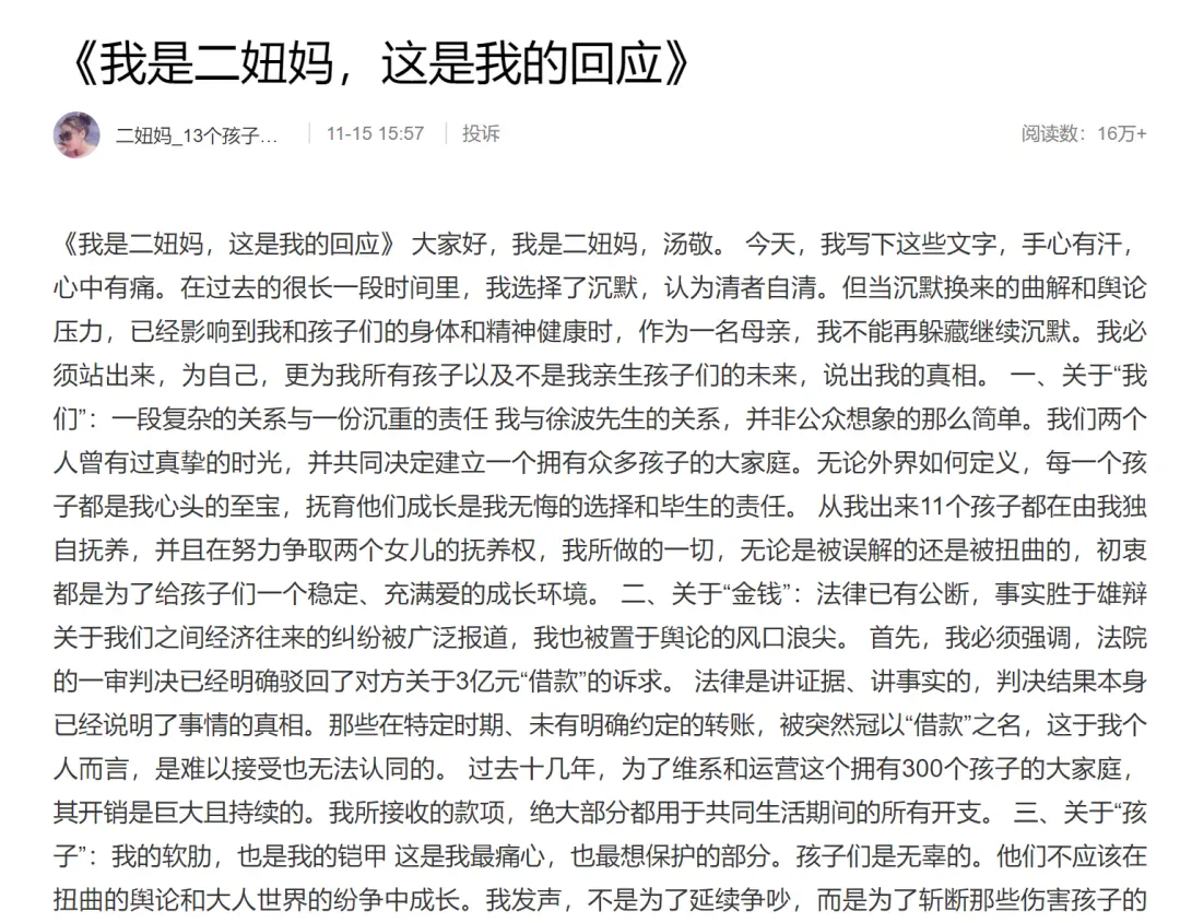 她表示与徐波的关系,并非公众想象的那么简单。两个人曾有过真挚的时光,并共同决定建立一个拥有众多孩子的大家庭。无论外界如何定义,每一个孩子都是心头至宝。“从我出来11个孩子都在由我独自抚养,并且在努力争取两个女儿的抚养权。”