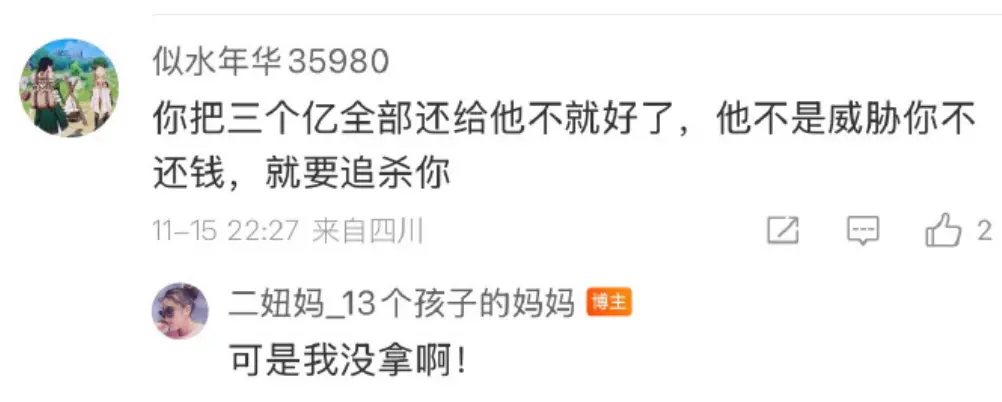 再就是去年,从把二妞妈夸到天上,画风一转,反目成仇,控诉她“卷款私逃”。