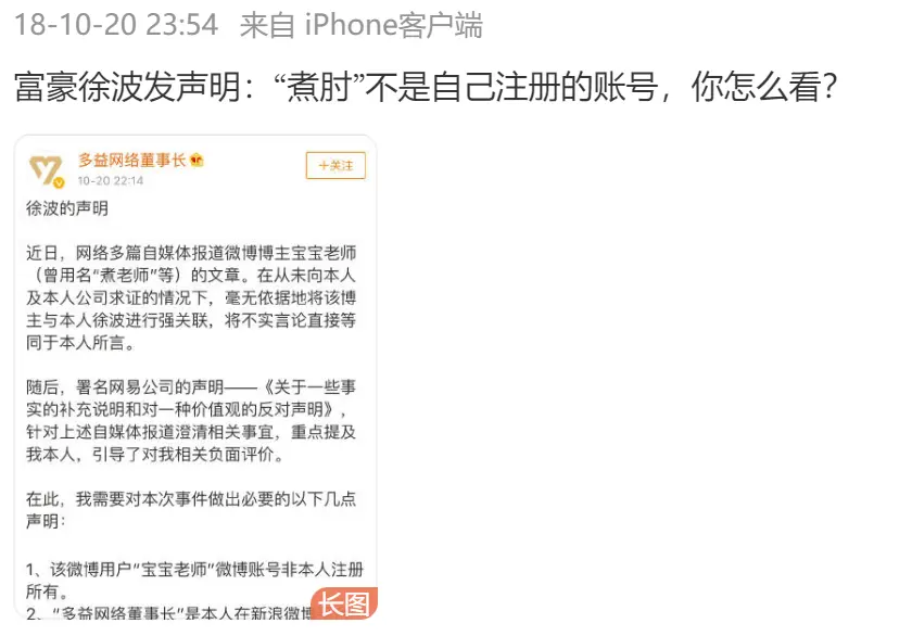 (不过,2018年徐波在多益网络董事长账号发声明称,宝宝老师,曾用名“煮老师”等,非本人注册所有。)