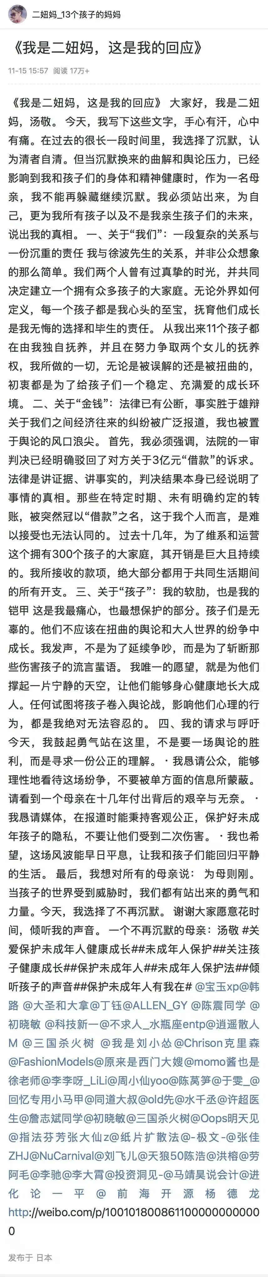 她发文讲述了与徐波的关系、金钱纠纷、孩子的相关事情。