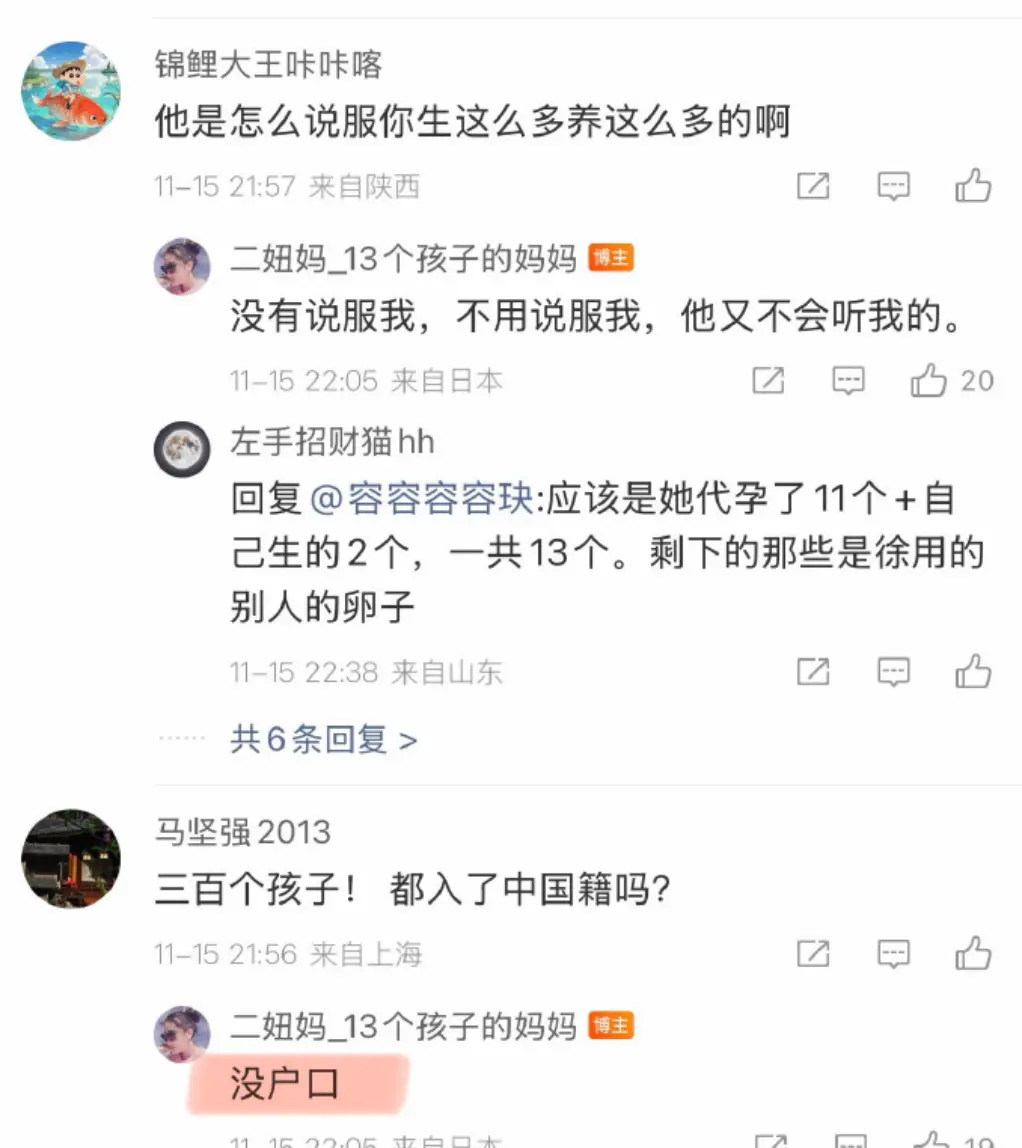 徐总是怎么说服她生这么多、养这么多的呢?她回复“没有说服我,不用说服我,他又不会听我的”。此外她称300个孩子没户口。