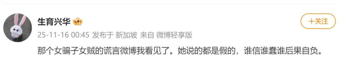 他表示二妞妈的微博看见了,“她说的都是假的,谁信谁蠢谁后果自负”。