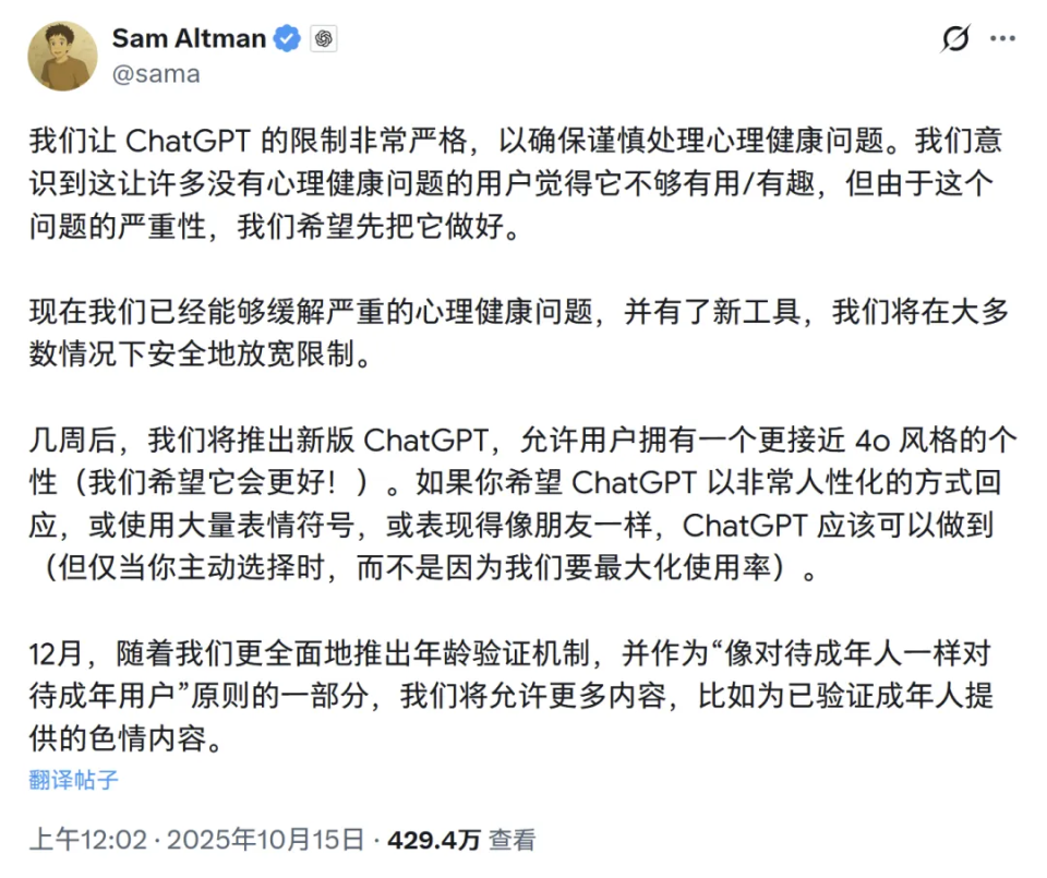 前段时间,OpenAI?的 CEO 山姆·奥特曼宣布,ChatGPT 将在 12 月推出“成人模式”,也就是说允许大家光明正大“搞黄色”了。