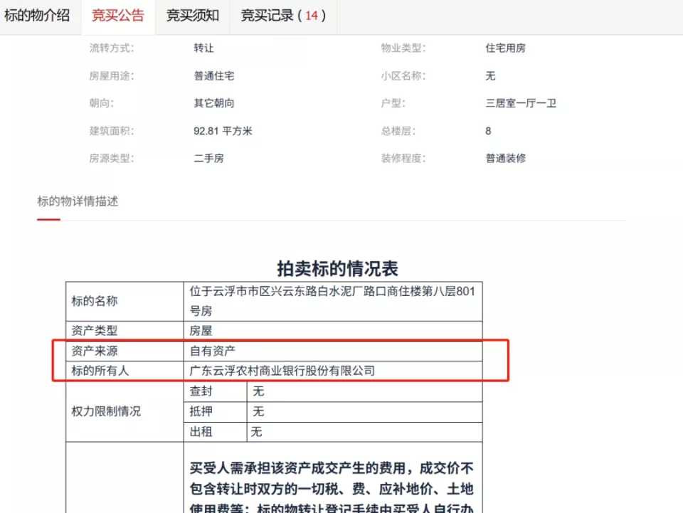 相较而言,广东云浮农村商业银行股份有限公司(以下简称“云浮农村商业银行”)的拍卖标的情况表更加一目了然:资产来源为自有资产,标的所有人为云浮农村商业银行。