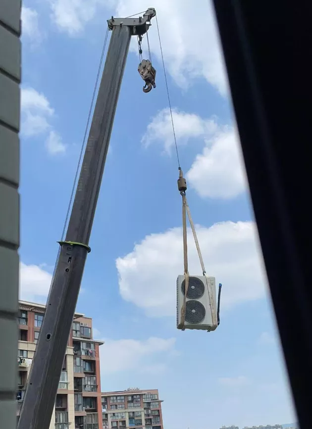 有的邻居实在没办法了,最后只能叫来一台大吊车,把外机直接从地上吊上去,场面十分“壮观”。