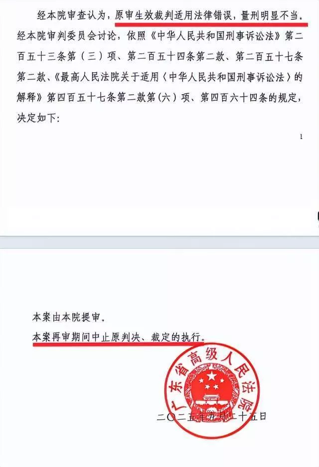 2025年9月25日,广东省高院出具再审决定书称,经该院审查认为,“原审生效裁判适用法律错误,量刑明显不当。”