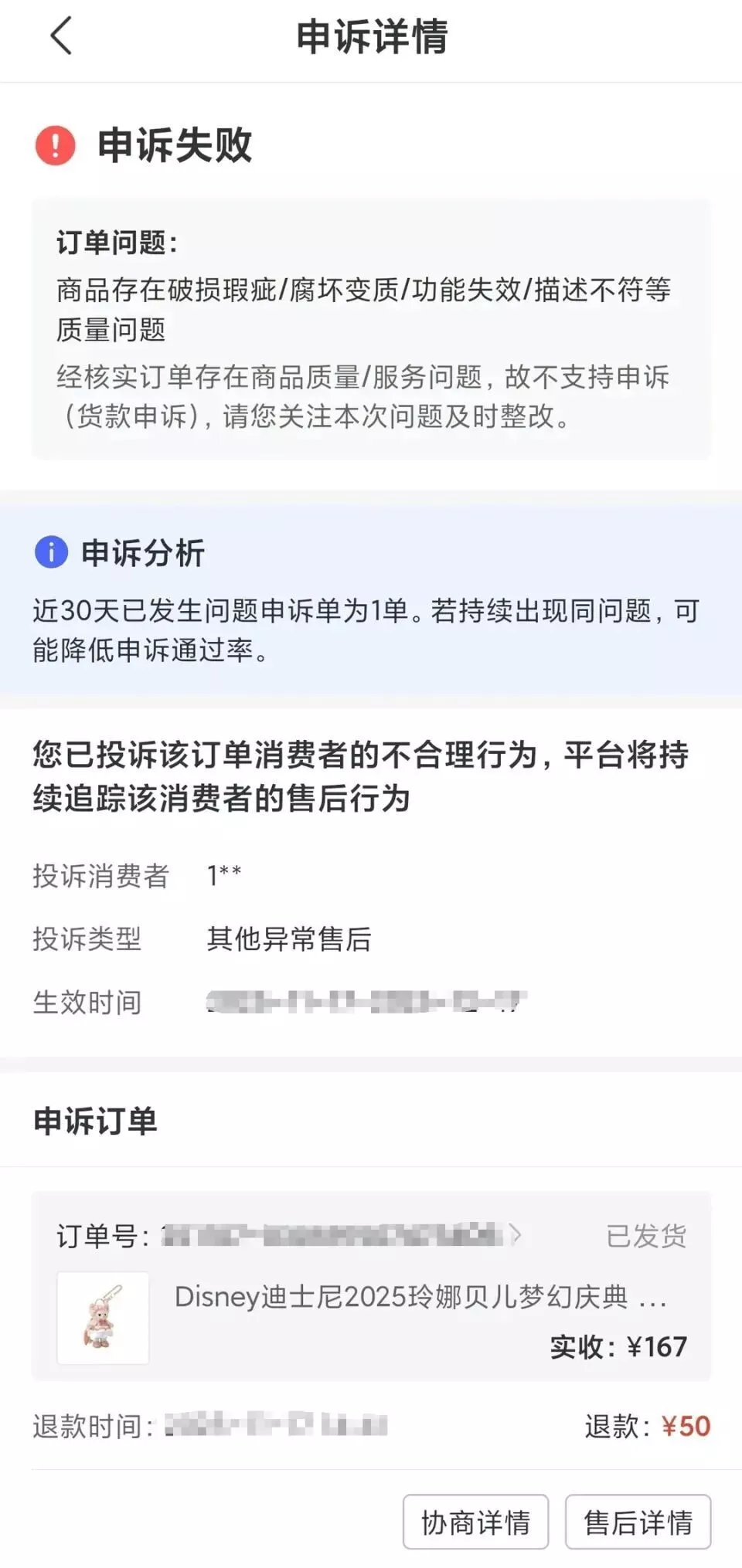可无奈的是,平台最后还是判买家胜诉,50 块钱退了出去,商家的申诉直接被驳回。