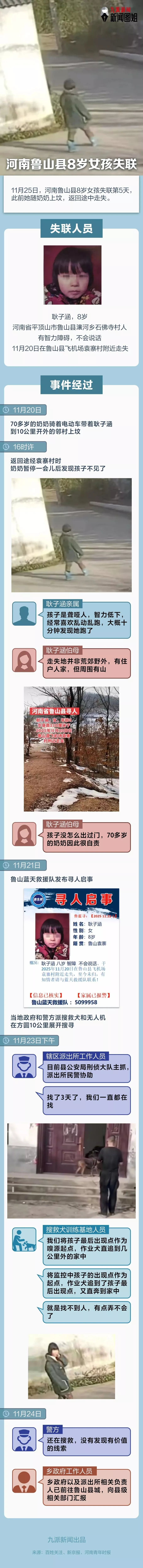 据此前报道,25日,鲁山县瀼河乡石佛寺村一村民告诉九派新闻,女孩是本村村民,事发时她陪同奶奶前往邻村上坟,奶奶“一不留神”便发现孩子不见,丢失地点离家约几里地。