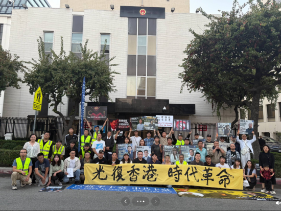 在2025年11月8日洛杉矶中国领事馆举行的中国民主党全国委员会第763次茉莉花行动集会中,中国民主党党员呼吁国际社会持续关注香港支联会三位核心成员——李卓人、何俊仁与邹幸彤——遭长期羁押的情况,并要求中共与香港当局立即、无条件释放三人。