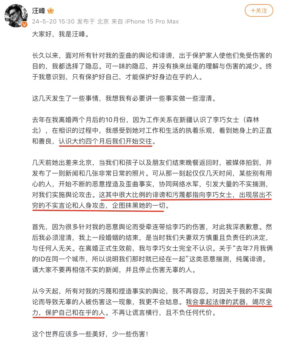 去年5月20日,他发文正式官宣这段恋情,提及自己是在与章子怡离婚2个月后,认识的森林北,两人认识4个月后开始交往。