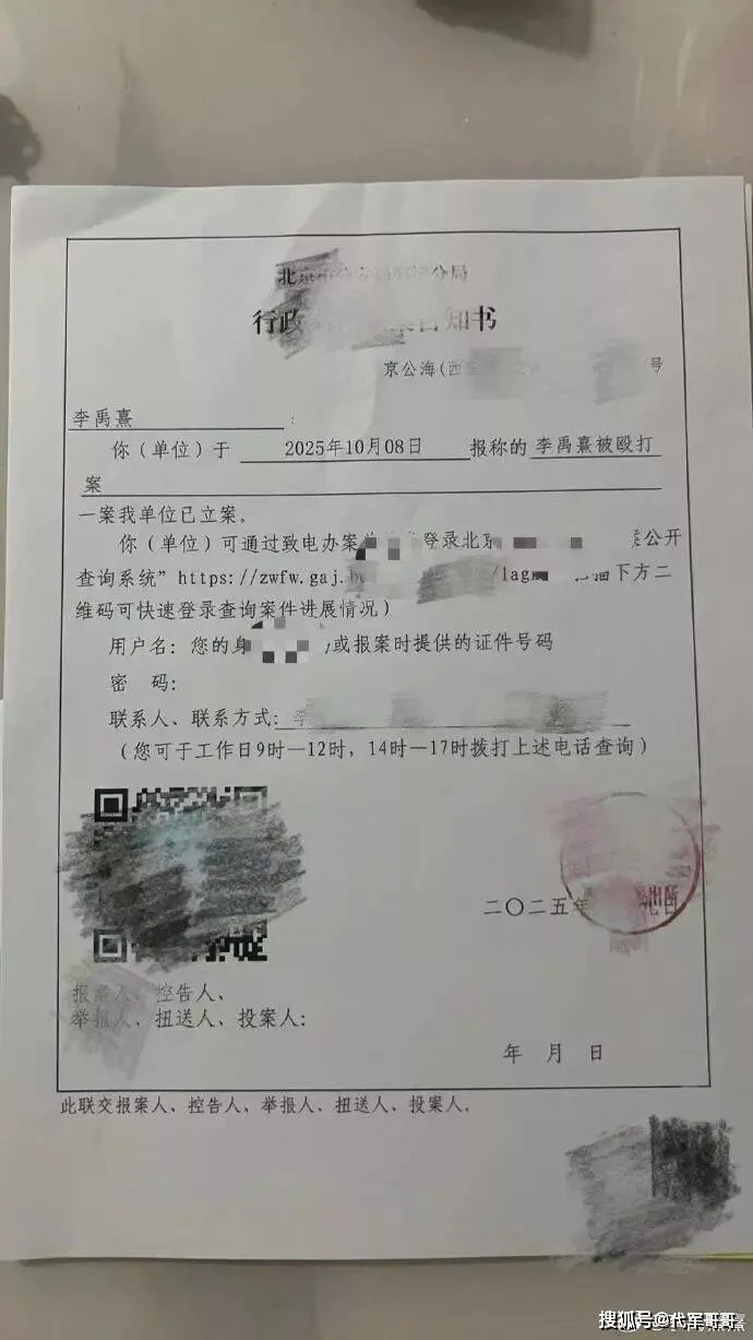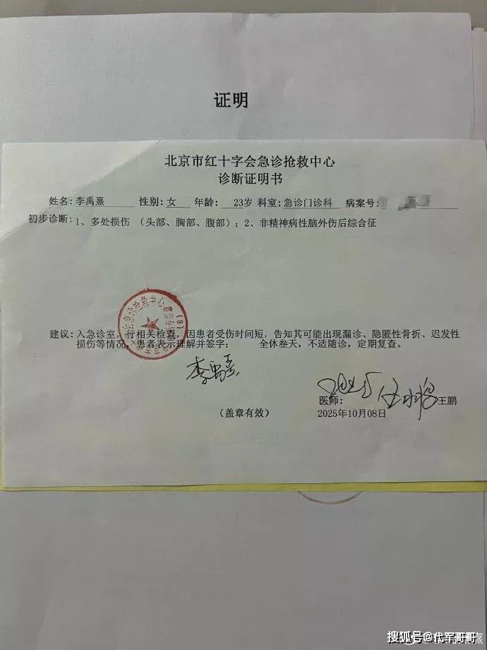 2025 年 10 月 8 日,李禹熹前往荣梓杉住所协商时,据称被 “拎起摔倒两次、进门踹一脚”,导致头部、肩部受伤。她提供的《立案告知书》显示警方已对 “李禹熹被殴打案” 立案,急诊诊断书明确 “脑外伤后综合征”,小区监控也记录了荣梓杉进入现场的过程。