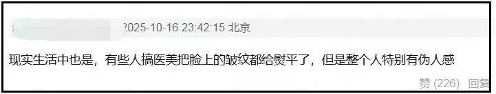 除了脸部僵硬外,曾黎的演技也被吐槽。不少观众觉得她的表演很扁平,在剧中动不动就发嗲、撒娇,对人物的理解很浅薄。重点是,她顶着这张医美过度的脸演绎大表情,更是充分暴露了面部缺陷,让人很出戏。