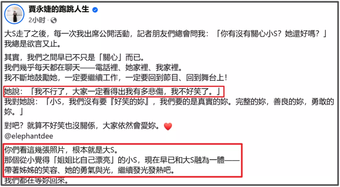 贾永婕还借此来鼓励小S,说小S小时候觉得“姐姐比自己漂亮”,现在早就和姐姐融为一体,希望她能带着大S的笑容、勇敢和光继续发光发热,我们都在等你回来。