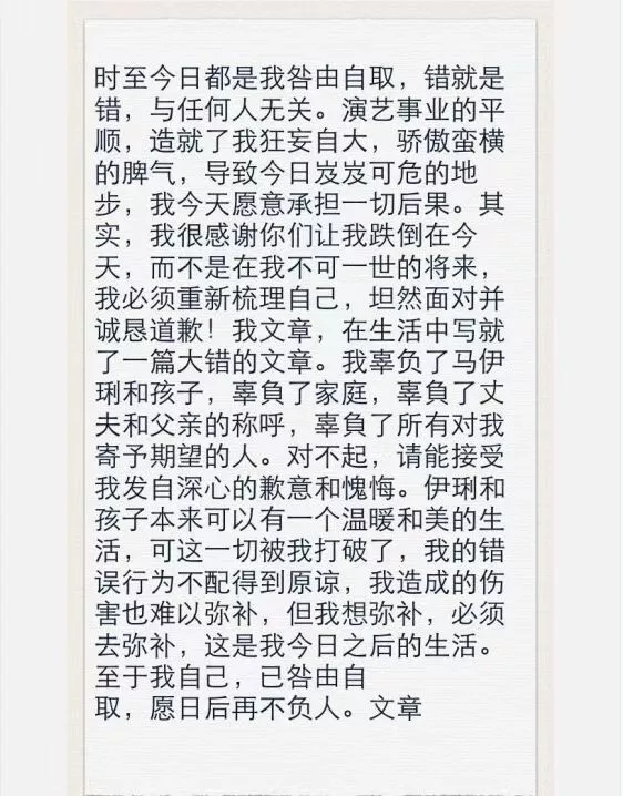 事情曝光后,文章于 3 月 31 日凌晨在微博发表声明,承认自己的出轨行为,言辞中满是对家庭的愧疚。