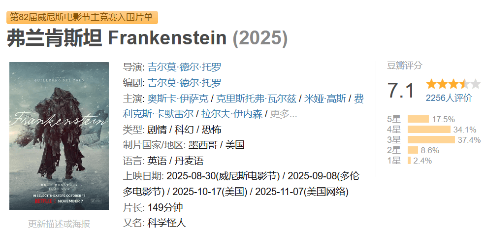 网飞出品,奥斯卡级王炸阵容,改编自史上第一部科幻小说《弗兰肯斯坦》