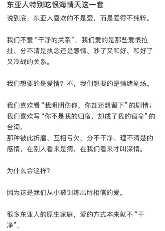 网上有个很火的讨论,为什么东亚人格外钟情于“恨海情天”这一套?一条高赞回答写道:因为那是我们从原生家庭学到的第一课。