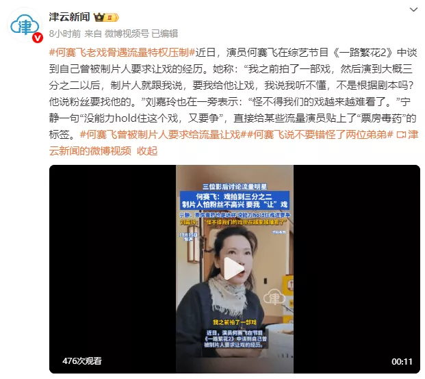 近日,演员何赛飞在综艺节目《一路繁花2》中谈到自己曾被制片人要求让戏的经历。她称:“我之前拍了一部戏,然后演到大概三分之二以后,制片人就跟我说,要我给他让戏,我说我听不懂,不是根据剧本吗?他说粉丝要找他的。”刘嘉玲也在一旁表示:“怪不得我们的戏越来越难看了。”宁静一句“没能力hold住这个戏,又要争”,直接给某些流量演员贴上了“票房毒药”的标签。