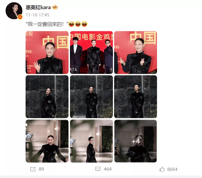 而就在4月份,她凭借《我爱你》中的角色,获得华表奖最佳女演员。当时她兴奋地写道:“惠英红一定会努力,不会让你们失望的!”