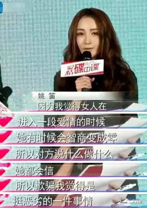 “因为我觉得女人进入一段爱情的时候,她有时候智商会变成零,所以对方说什么做什么,她都会信。”