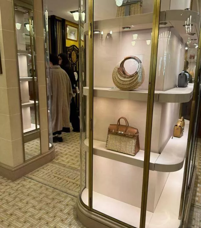 、黑色鞋子。她手里拿着一件白色毛茸茸外套,眼睛看着专柜里的爱马仕包。仔细看发现,她的气质很好。